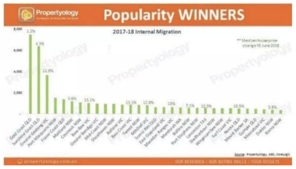 黄金海岸成为全澳之最的原因并不只是景色优美这么简单,其背后有几点主要影响因素。据房市分析专家 Propertyology的最新研究显示,州际迁移正在推动房价的发展。房产研究主管 Simon Pressley表示:“黄金海岸是人气购房榜单上的第一位,”报告中指出,悉尼的房屋中位价为95万澳元,而黄金海岸的房屋中位价仅为63万澳元。Ray White Surfers Paradise的首席执行官 Andrew Bell表示,40年来,州际移民一直是黄金海岸房市的支柱。Bell进一步说明,价格的差异意味着州际移民会将自己原有的房产售出,再在黄金海岸买房,这样就能获得差价。不难理解为什么婴儿潮一代会选择黄金海岸作为他们退休后的栖身之地,绿海蓝天,白沙棕榈,谁不愿意生活在如此美丽的城市呢?Alex Phillis Real Estatel的 Alex Phillis今年举家从阿德菜德迁居至黄金海岸。他表示,州际移民很乐意为黄金海岸的生活方式“买单”,尤其是50岁左右的居民。房产研究主管 Simon Pressley还表示,昆州的州际移民人数还在不断増加,載至今年6月的一年时间内,昆士兰州的州际移民人数就已经达到了2.9万。与此同时,有2.7万澳人离开了悉尼,创历史新高。